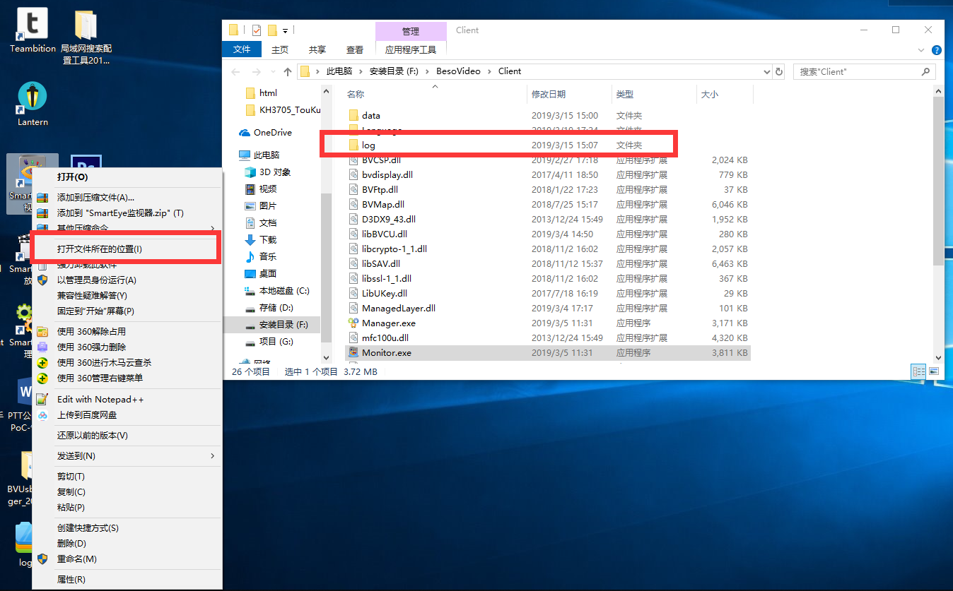 右键点击客户端图标,选择“打开文件所在位置”,获取log文件夹。