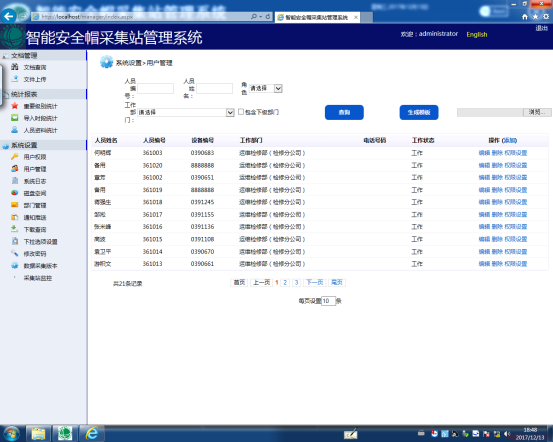 单击【设备管理】按钮,同样弹出一个如图6所示的登录界面,在人员编号栏和密码栏分别输入人员编号和密码(人员编号:admin,密码:123456)然后单击【登陆】按钮即可进入设备管理界面,如图10所示。