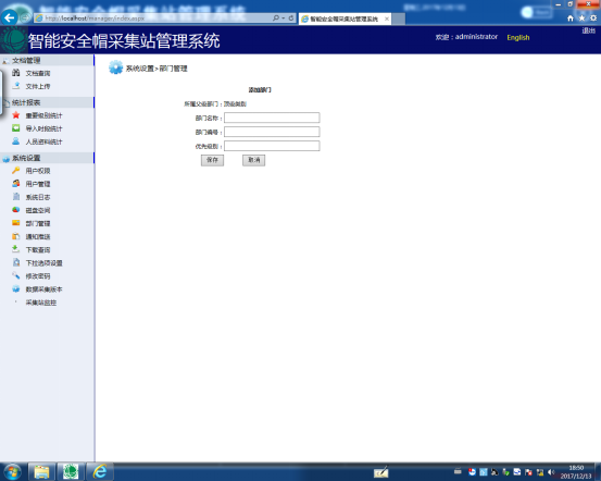 点击【添加部门】按钮弹出如图27所示的部门添加项,这里的部门可以分级添加,比如最高部门为“深圳市公安局”所需设置的优先等级为1,而其下属部门则可依次添加但优先等级设置必须大于1。也可以为已添加的部门添加子部门,点击【添加子类】按钮弹出添加子类界面,如图28所示。
