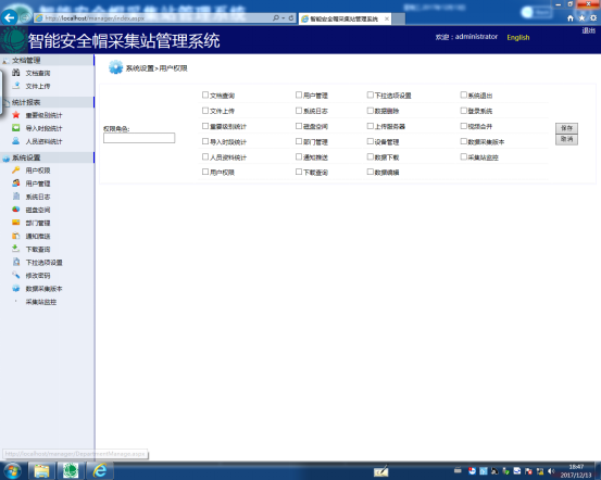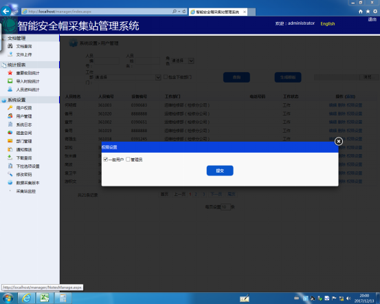 单击图23所示用户管理界面上的【添加】按钮,弹出如图24所示的添加用户界面,然后根据提示填写相应的信息即可,点击【保存】按钮即可保存添加的人员信息。(需要说明的是智能安全帽的柜子总共有20个锁,添加用户时,每添加一个用户对应一个锁位,不能重复添加。)我们可以在【用户管理】界面对用户进行编辑、删除和权限设置等操作。在这里我主要说一下权限设置操作,具体步骤如下:单击【权限设置】按钮会弹出如图25所示的权限设置界面,选择相应的权限角色即可,如图25我们选择的权限角色为一般用户。单击【提交】按钮即可保存为用户设置的权限。