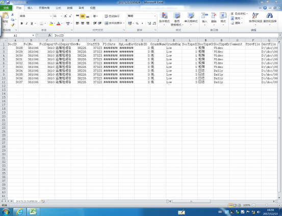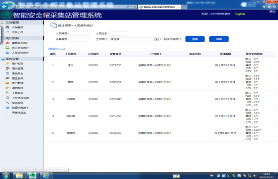 选择并输入相应的条件,如选择【人员编号】、【人员姓名】、【设备编号】、【工作部门】等条件再输入相关信息,然后点击【查询】按钮进行查询。如果不输入相关条件直接单击【查询】按钮则系统默认显示该项全部内容,自动生成相应警员资料报表,如需导出资料报表则点击【导出】按钮即可导出Excel表如下图19所示。