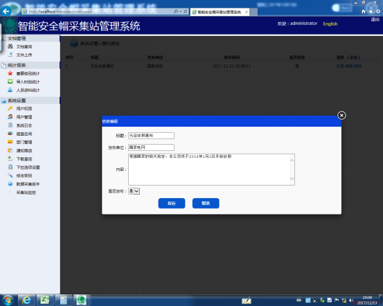 点击“添加”就可弹出图30所示的编辑页面,编写所要下发的信息,点击提交即可下发。消息推送的功能主要将服务器的通知、公告之类的信息下发到各个采集站公告栏上