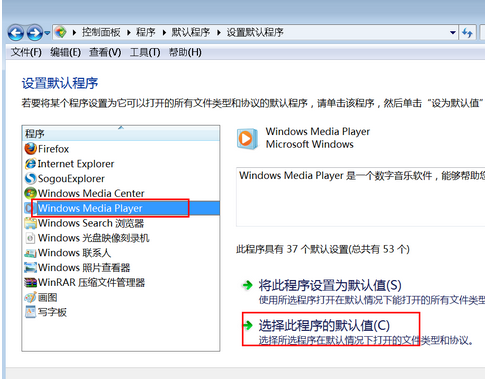 2、此时会出现设置默认程序的窗口,点击窗口左边的“Windows Media Player”,然后点击右边的“选择此程序的默认值”;