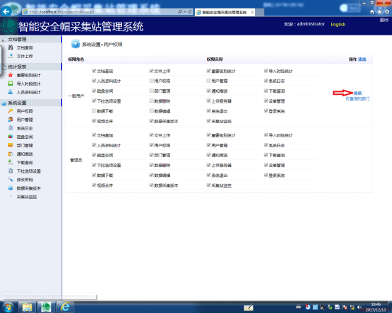 图20主要是管理员对各个用户设置角色权限的编辑界面,管理员拥有所有的权限,而其他用户则需管理员设置其所需的权限。设置权限的步骤如下:单击图20红色箭头标记的【编辑】按钮进入图21所示的为一般用户设置相应权限的编辑界面,勾选对应的权限单击【更新】按钮即可保存。我们也可以根据实际需要添加权限角色,为用户设置权限时,选择相应的权限角色即可。添加权限角色的步骤如下:在图20中我们单击【添加】按钮弹出一个添加权限角色的窗口如图22所示,我们在【权限角色】栏填写权限角色名称,勾选想设置的权限,然后点击【保存】按钮即可。