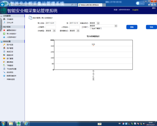 点击选择开始时间和结束时间,再选择并输入相应的条件,如【采集站标记】级别、【导入时段】、【工作部门】,如果不输入条件,则系统默认显示全部内容,然后点击【查询】按钮,自动生成不同时段的数量柱状图报表,如下图18所示。