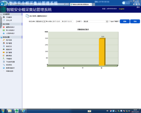点击选择开始时间和结束时间后,点击查询,自动生成不同级别的数量柱状图报表,如图17所示。
