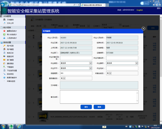 文档编辑:选择要编辑的文件单击【编辑】选项会弹出一个【文档编辑】窗口即可对该文件进行编辑,如图7所示。可以对文件的【采集站级别】、【服务器级别】和【保存期限】等信息进行编辑。