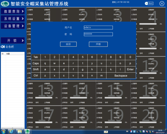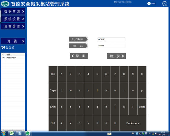 单击智能安全帽采集站管理系统主界面上的【数据查询】按钮会弹出一个登陆界面,如图6所示。在人员编号栏和密码栏分别输入人员编号和密码(人员编号:admin,密码:123456)单击【登陆】按钮即可进入数据查询主界面,如图7所示。