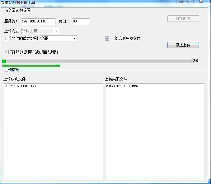 在该界面上可以对服务器的参数进行设置。服务器后面方框中的“192.168.0.199”为服务器的IP,端口后面方框中的“80”为服务器的端口号。用户可以把这里的服务器IP和端口号改成自己服务器的IP及其所对应的端口号。用户可以对要上传文件的重要级别进行选择,可以选择全部上传,也可以选择只上传重要的文件。勾选【上传后删除原文件】选项,上传后会自动删除采集站中的原文件。勾选【存储时间到期的数据自动删除】选项,到期后服务器中的数据会自动清除。修改完成后单击【保存参数】按钮即可保存修改的参数。单击【启动上传】按钮即可把采集站中的数据上传到服务器。
