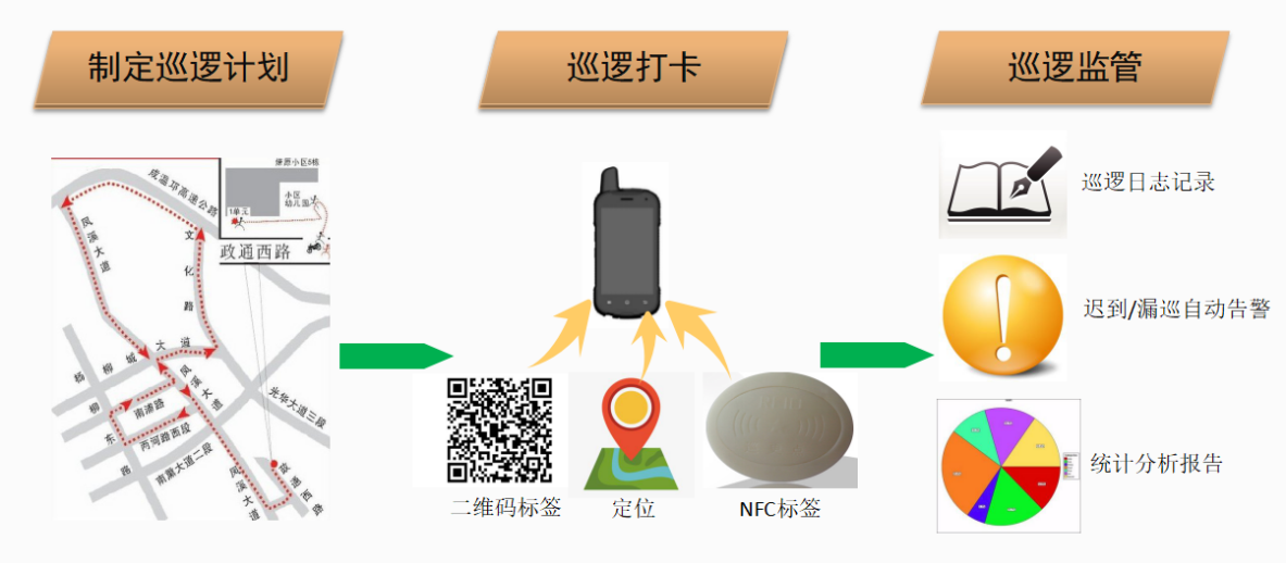 巡检管理:巡检监管、巡检计划管理、巡点管理、巡检实施情况、设备巡检(到期提示、漏检报警)、巡点到位情况、巡检统计分析等