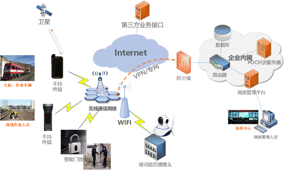 该产品以无线通讯技术为核心,集成全球定位技术、POC对讲通讯技术、GIS技术,并结合铁路系统自身作业业务流程,实现对铁路作业的全过程进行管控,包括现场调度、通讯、现场监控、巡检、作业管控等。