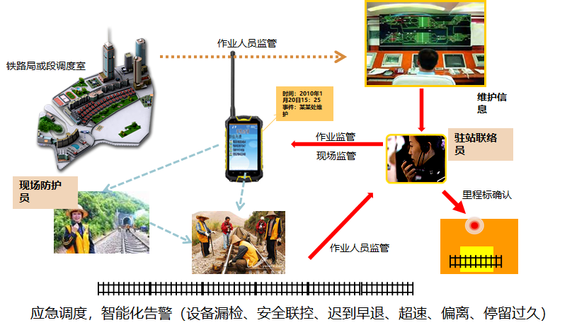本产品通过现场施工人员携带的三防手持智能终端,集合平台“音视频实时传输、电子围栏、巡检计划、对讲防护、作业计划管理、录音回放、图像上传、设备管理”等功能,将生产调度、监控监测、应急处置融为一体,实现对讲、电话、视频、信息、会议、调度为一体的信息集成与共享综合应用,发挥作业现场盯控、应急处置指挥、电视电话会议的功能作用,提升铁路安全生产调度及应急指挥能力。