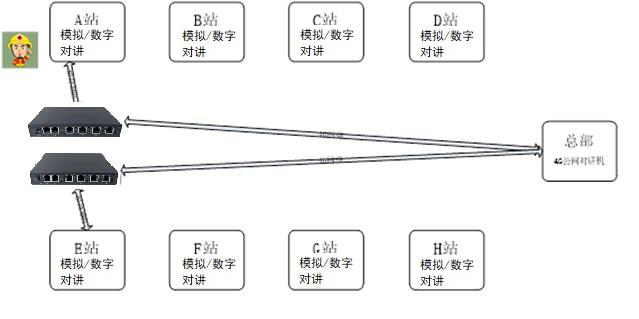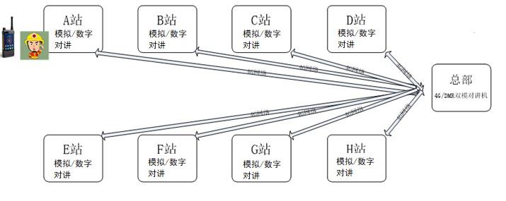 如左图所示,总部巡检人员到各站做巡检,由于各站历史存量大量模拟和数字对讲机,或部分站点使用公网对讲机,造成巡检人员到现场后无法与站点的各类对讲机互通。